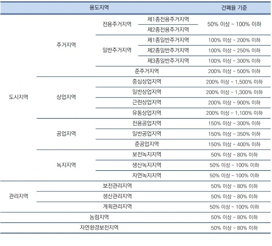 | 지자체 조례 (도시계획조례) | 해당 지역 여건에 따라 세부 건폐율·용적률 규정 (실제 적용 기준) |